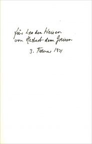 Im Gespräch skizzierte Leo Löwenthal die Aufstellung seiner Bücher und hob einige Exemplare und Ausgaben besonders hervor. Zu zwei Widmungen von Max Horkheimer berichtete er: „In der Sammlung von Horkheimer, von dem sehr wenig veröffentlicht wurde in der Zeit, in der er in Amerika gelebt hat, befindet sich in ‚Anfänge der bürgerlichen Geschichtsphilosophie’ eine Inschrift von Max Horkheimer an mich ‚Für L. L. Vivant sequentes! Ihr M. H.’ Das bezieht sich darauf , daß Horkheimer und ich ein oder zwei Nächte, 24 Stunden ununterbrochen, an der endgültigen Fassung dieses Buches gearbeitet haben, das aus Vorlesungen hervorgegangen ist und das rasch produziert werden mußte, weil zur Ernennung Horkheimers als Philosophieprofessor eine Veröffentlichung fehlte und die wurde also damit hergestellt. In diesem Zusammenhang möchte ich auch die ‚Eclipse of reason’ erwähnen, an der ich sehr viel editorisch mitgearbeitet habe, die übrigens auch aus Vorlesungen hervorgegangen ist und in der ein langes, handgeschriebenes Gedicht von Lombroso steht. Hier schreibt Horkheimer, was auch wieder sehr bezeichnend für die Beziehung ist, die ich in den wichtigen Jahren unserer Zusammenarbeit zu ihm hatte, ‚Ich glaube, daß wir bis zu dieser Stunde noch nicht im Kreise getrottet sind, wir wollen alles versuchen, um uns auch in der Zukunft nicht fesseln zu lassen, Ihr Max.’ Ich kann das nur mit Rührung jetzt nachträglich betrachten."