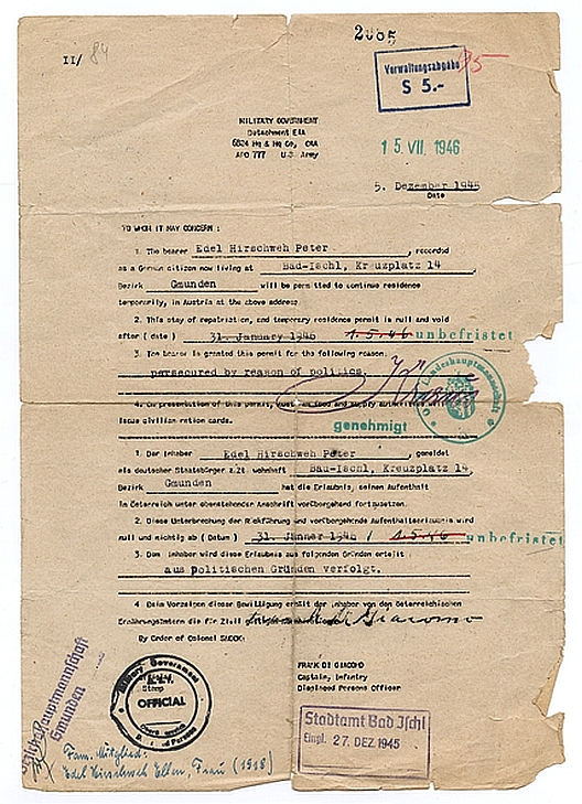 - Mehrfach verlängerte Aufenthaltsgenehmigung für Peter Edel, Military Government, U.S. Army, 1945-1946, Nr. 1004