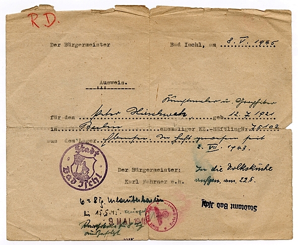 - Ausweis, Bad Ischl 8.5.1945, Vorder- und Rückseite, Nr. 1002. Mit Vermerk über Aufnahme in die Volksküche auf der Vorderseite und über vorherige Verpflegung im Kurhaus sowie Ausgabe von Bekleidung („1 Hemd, 1 Unterhose, 2 P. Socken“) auf der Rückseite