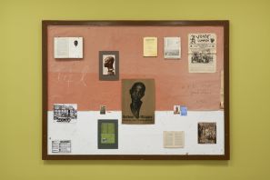 Pinnwand mit Fotografien, Dokumenten, Magazinen, Büchern und diversen Materialien, gerahmt 150 x 250 cm, Installationsansicht in der Ausstellung „WER WIR SIND. Fragen an ein Einwanderungsland“, Bundeskunsthalle, Bonn (25. Mai – 8. Oktober 2023)