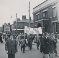 Demonstration mit Banner „Let Paul Robeson Sing“, Manchester, um 1956